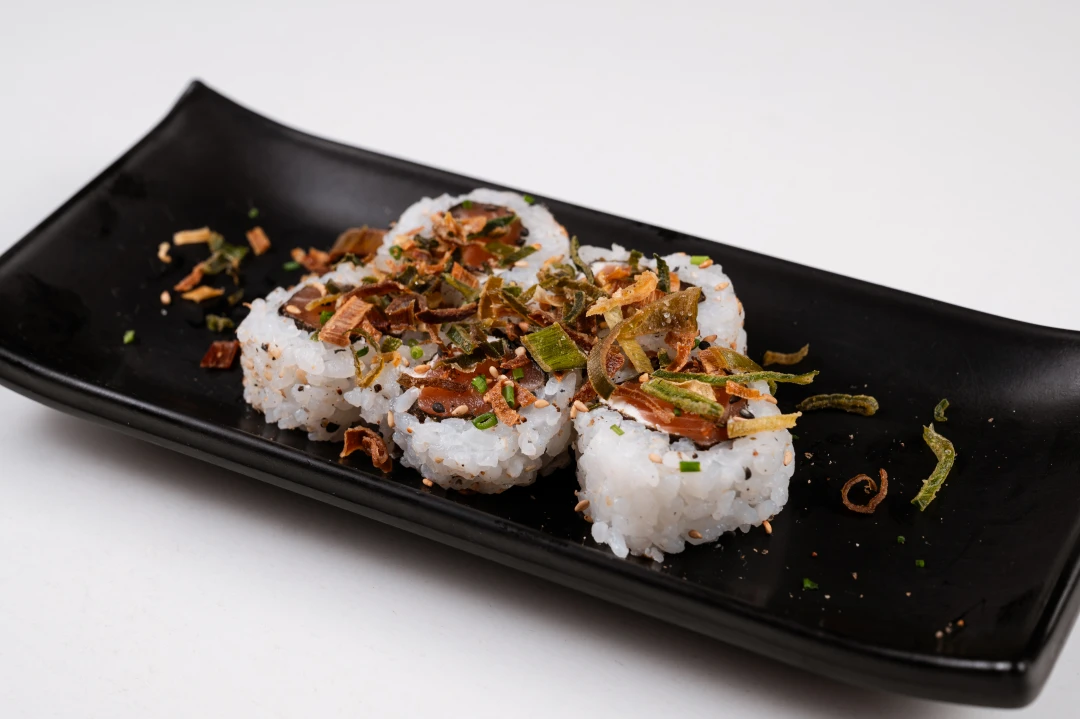 Uramaki de camarão empanado com uma fina lamina de manga maçaricada com açucar mascavo.