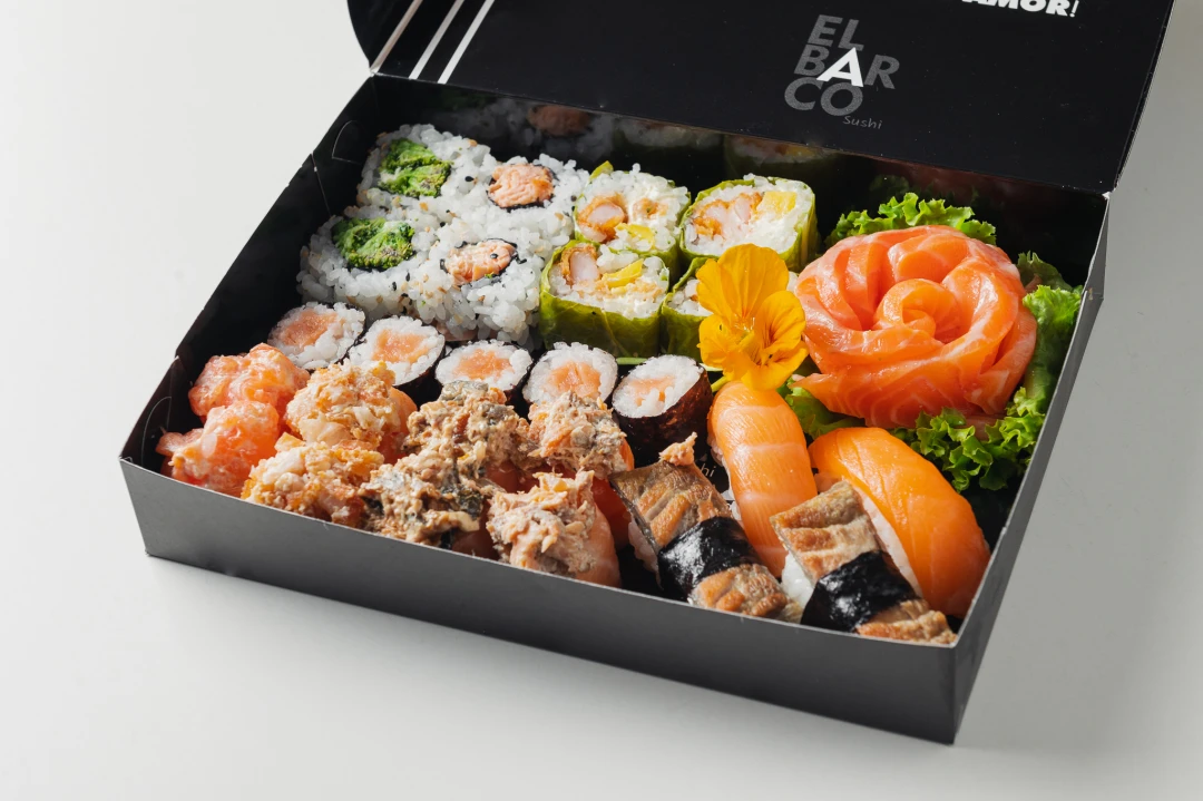 24 peças - 3 Niguiri ebi, 3 Niguiri maçaricado c/ queijo, 6 Uramaki samurai, 6 Gunkan ultraman e 6 Sashimi maçaricado