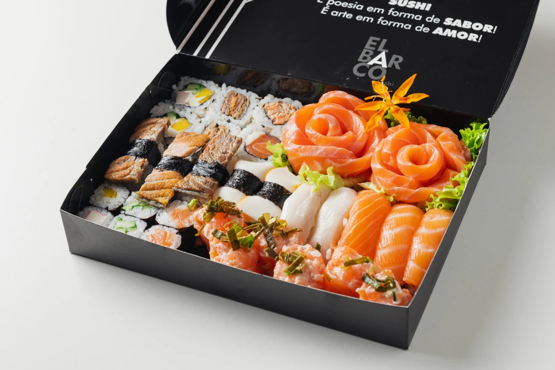 26 peças - 4 Sashimi, 4 Niguiri variados, 4 Uramaki variados, 4 Gunkan, 4 Gunkinha e 6 Hossomaki