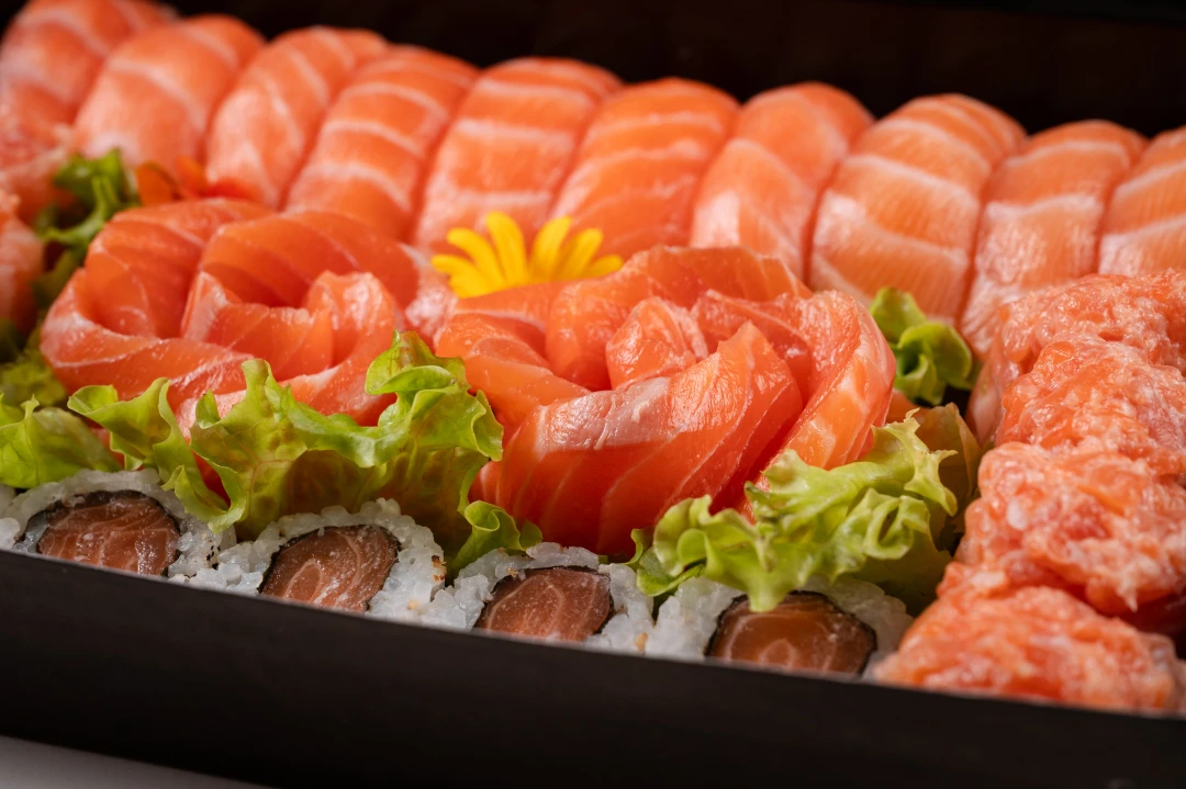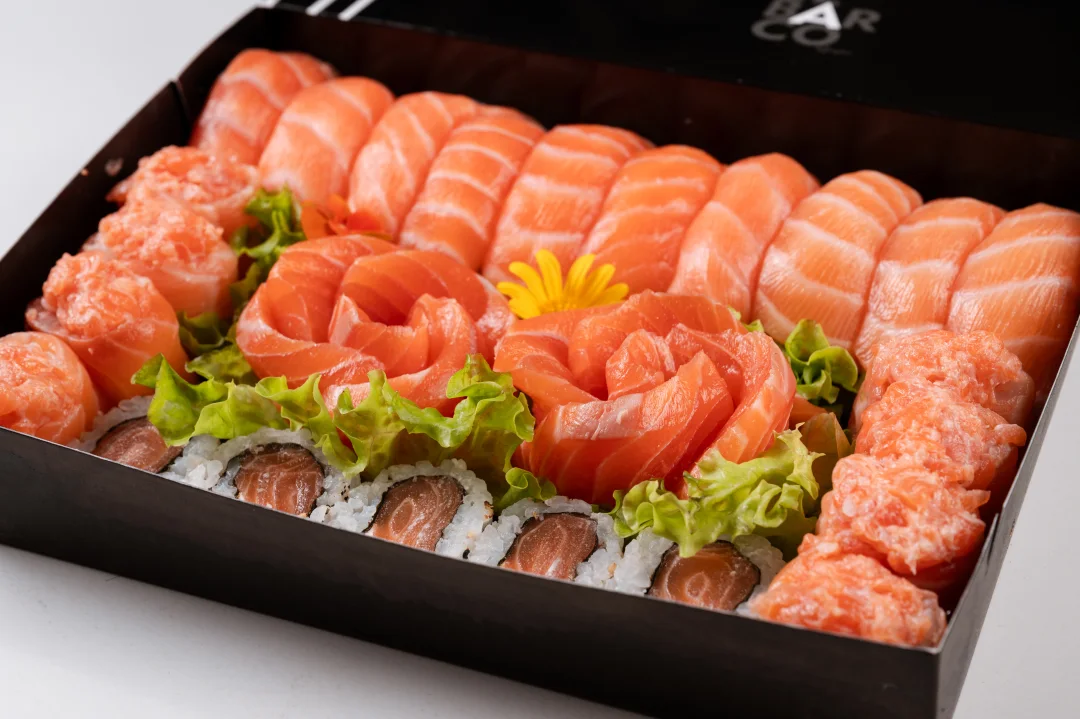 33 peças todas em salmão - 5 Uramaki, 8 Gunkan, 10 Sashimi e 10 Niguiri
