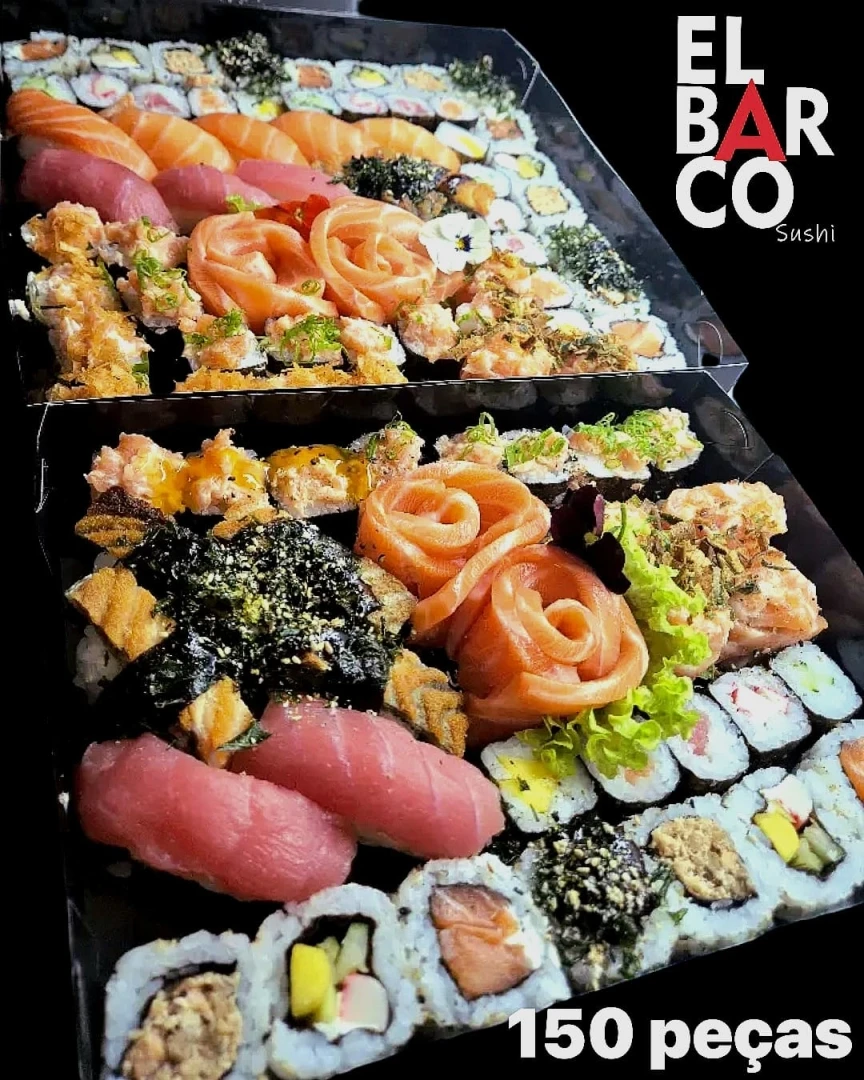 30 sashimi, 35 uramaki variados, 35 hossomaki variados, 30 niguiri variados, 15 gunkan, 30 gunkinha, 15 acelgamaki, 4 salada sunomono, 20 hot filadelfia