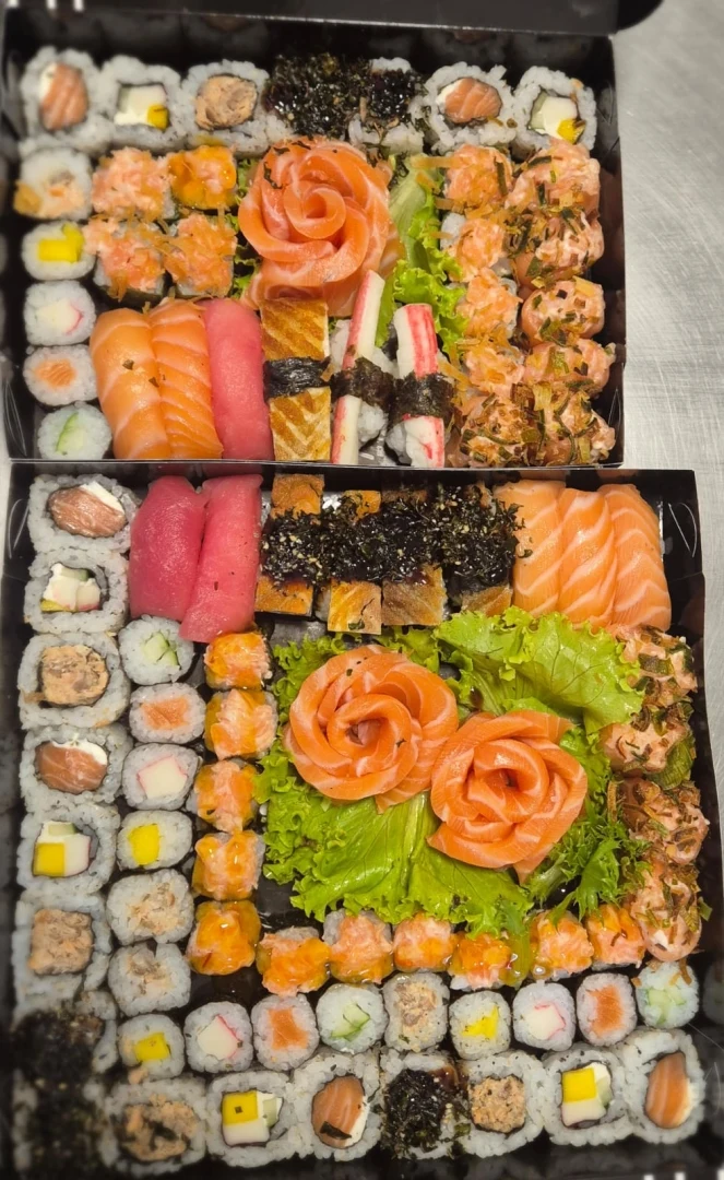 10 Sashimi, 15 Uramaki variados, 15 Hossomaki variados, 10 niguiri variados, 5 Gunkan, 5 Acelgamaki, 10 Gunkinhas, 10 hot filadelfia e 2 Salada Sunomono