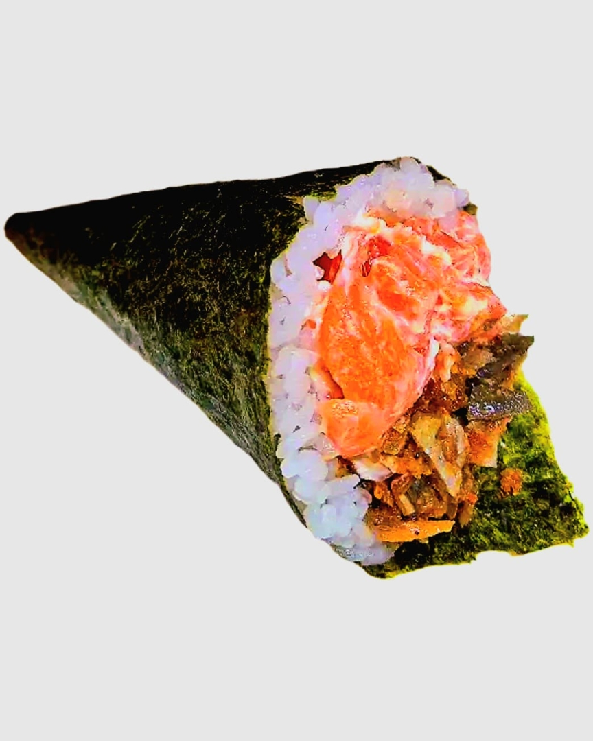 Pele de salmão grelhada, cream cheese, tarê e gergelim