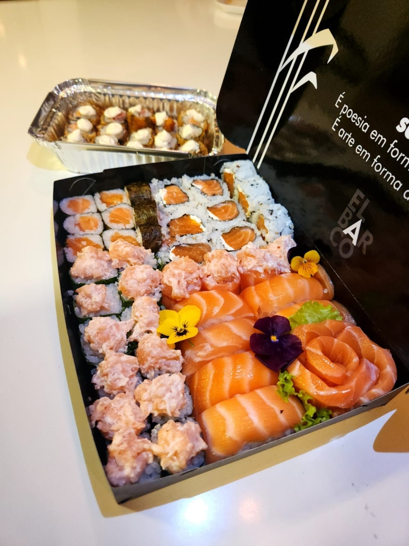 2x Salada Sunomono, 4x Sashimi, 4x Gunkan, 6x niguri, 6x Acelgamaki, 6x Gunkinha, 9x Uramaki, 9x Hossomaki e 15x hot filadelfia