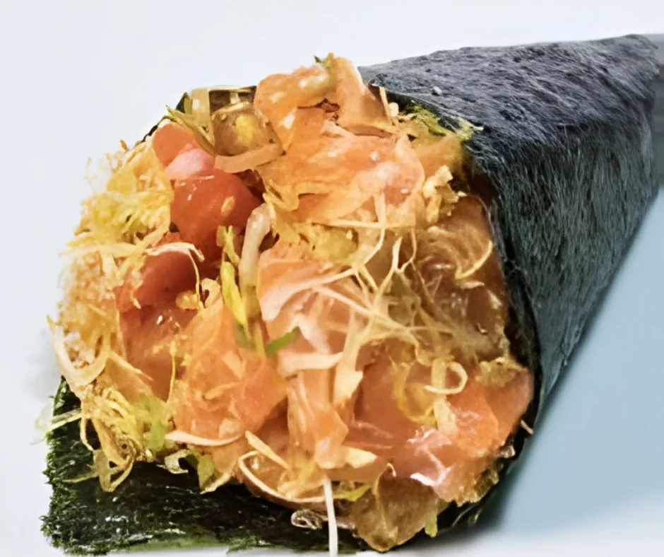 Temaki Salad preparado com salmão fresco grelhado desfiado e cream cheese cremoso, enrolado em uma alga crocante com arroz temperado. Simples, tradicional e irresistível.